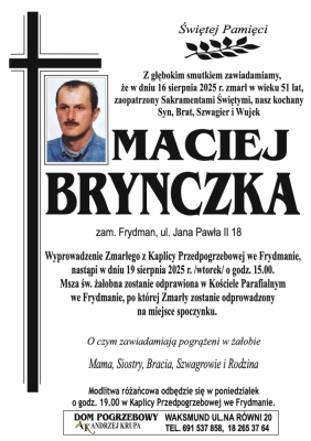 16 sierpnia 2025 roku w wieku 51 lat zmarł Maciej Brynczka zamieszkały we Frydmanie przy ulicy Jana Pawła II 18. Msza Święta żałobna zostanie odprawiona we wtorek 19 sierpnia o godzinie 15.00 w kościele parafialnym we Frydmanie, po której Zmarły zostanie odprowadzony na miejsce wiecznego spoczynku.