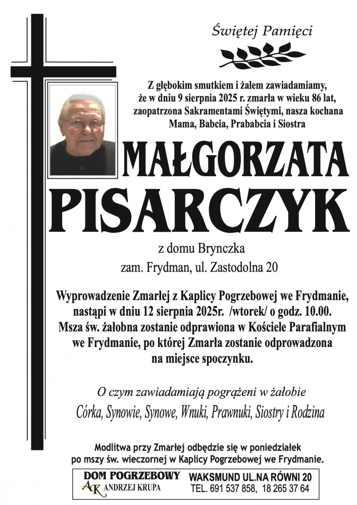 9 sierpnia 2025 roku w wieku 86 lat zmarła Małgorzata Pisarczyk z domu Brynczka zamieszkała we Frydmanie przy ulicy Zastodolnej 20. Msza Święta żałobna zostanie odprawiona we wtorek 12 sierpnia o godzinie 1o.00 w kościele parafialnym we Frydmanie, po której Zmarła zostanie odprowadzona na miejsce wiecznego spoczynku.