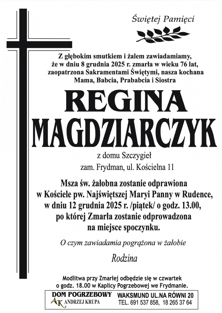8 grudnia 2025 roku w wieku 76 lat zmarła Regina Magdziarczyk zamieszkała we Frydmanie przy ulicy Kościelnej 11. Msza Święta żałobna zostanie odprawiona w piątek 12 grudnia o godzinie 13.00 w kościele Najświętszej Maryi Panny w Rudence (województwo podkarpackie), po której Zmarła zostanie odprowadzona na miejsce wiecznego spoczynku