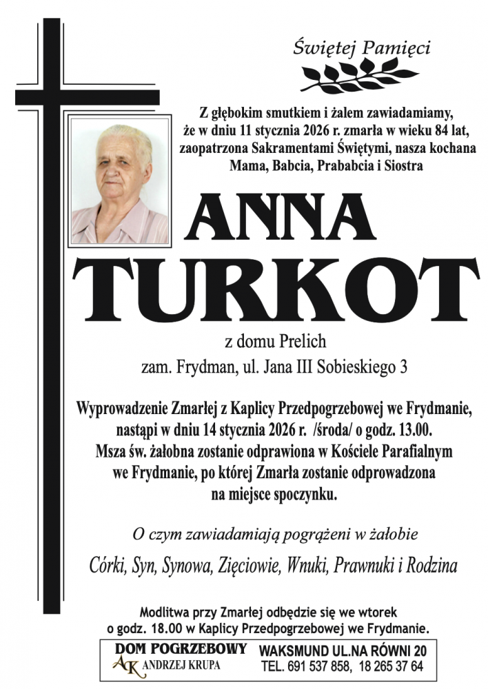 11 stycznia 2026 roku w wieku 84 lat zmarła Anna Turkot z domu Prelich zamieszkała we Frydmanie przy ulicy Jana III Sobieskiego 3. Msza Święta żałobna zostanie odprawiona w środę 14 stycznia o godzinie 13.00 w kościele parafialnym we Frydmanie, po której Zmarła zostanie odprowadzona na miejsce wiecznego spoczynku.