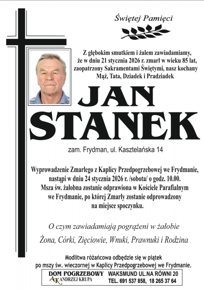 21 stycznia 2026 roku w wieku 85 lat zmarł Jan Stanek zamieszkały we Frydmanie przy ulicy Kasztelańskiej 14. Msza Święta żałobna zostanie odprawiona w sobotę 24 stycznia o godzinie 10.00 w kościele parafialnym we Frydmanie, po której Zmarły zostanie odprowadzony na miejsce wiecznego spoczynku.