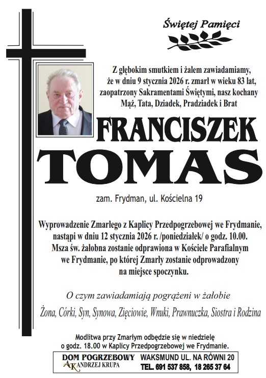 9 stycznia 2026 roku w wieku 83 lat zmarł Franciszek Tomas zamieszkały we Frydmanie przy ulicy Kościelnej 19. Msza Święta żałobna zostanie odprawiona w poniedziałek 12 stycznia o godzinie 10.00 w kościele parafialnym we Frydmanie, po której Zmarły zostanie odprowadzony na miejsce wiecznego spoczynku.